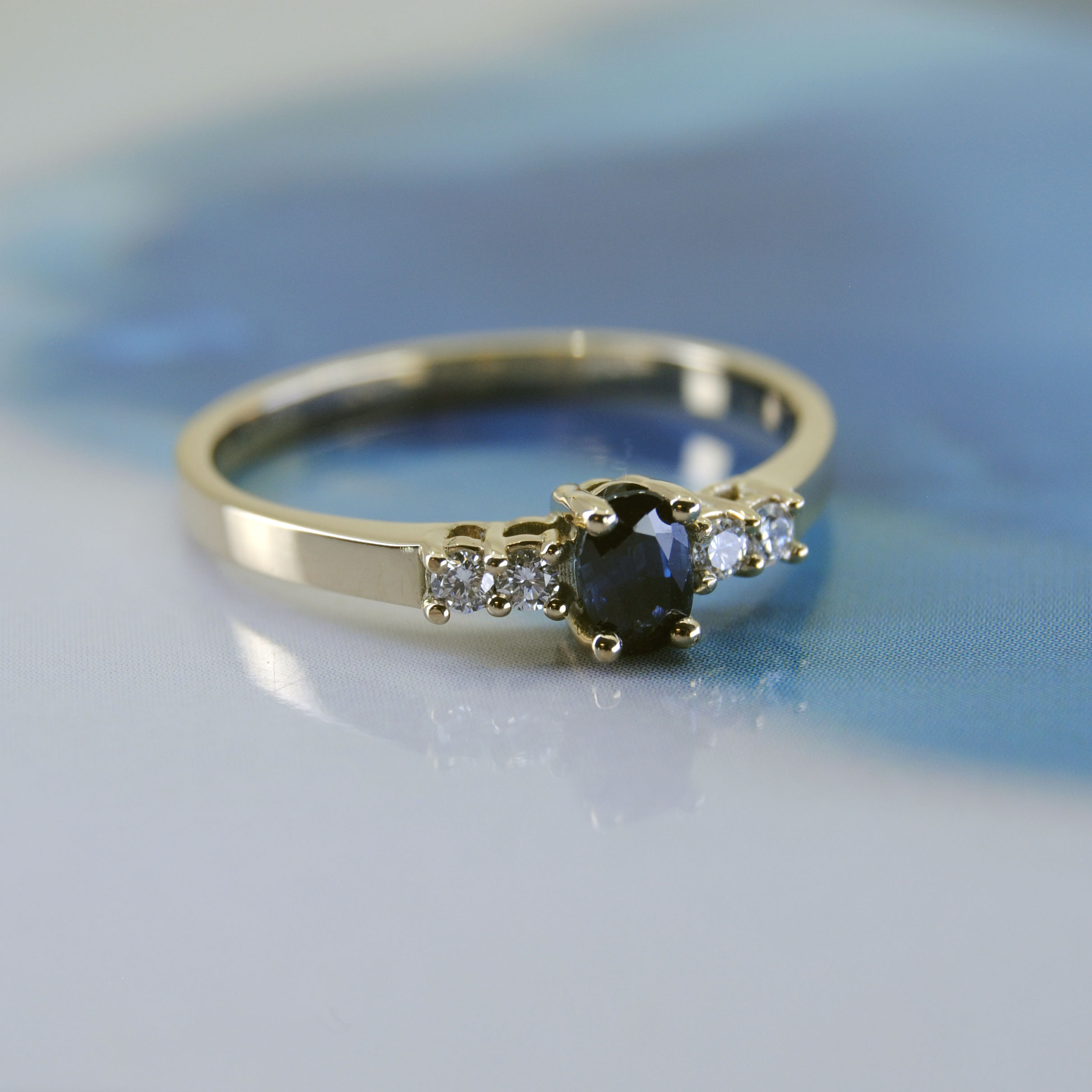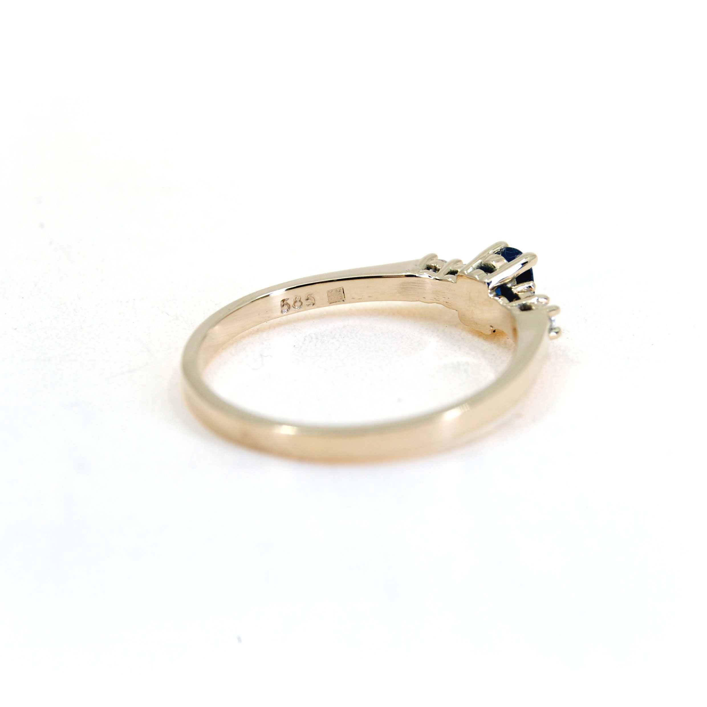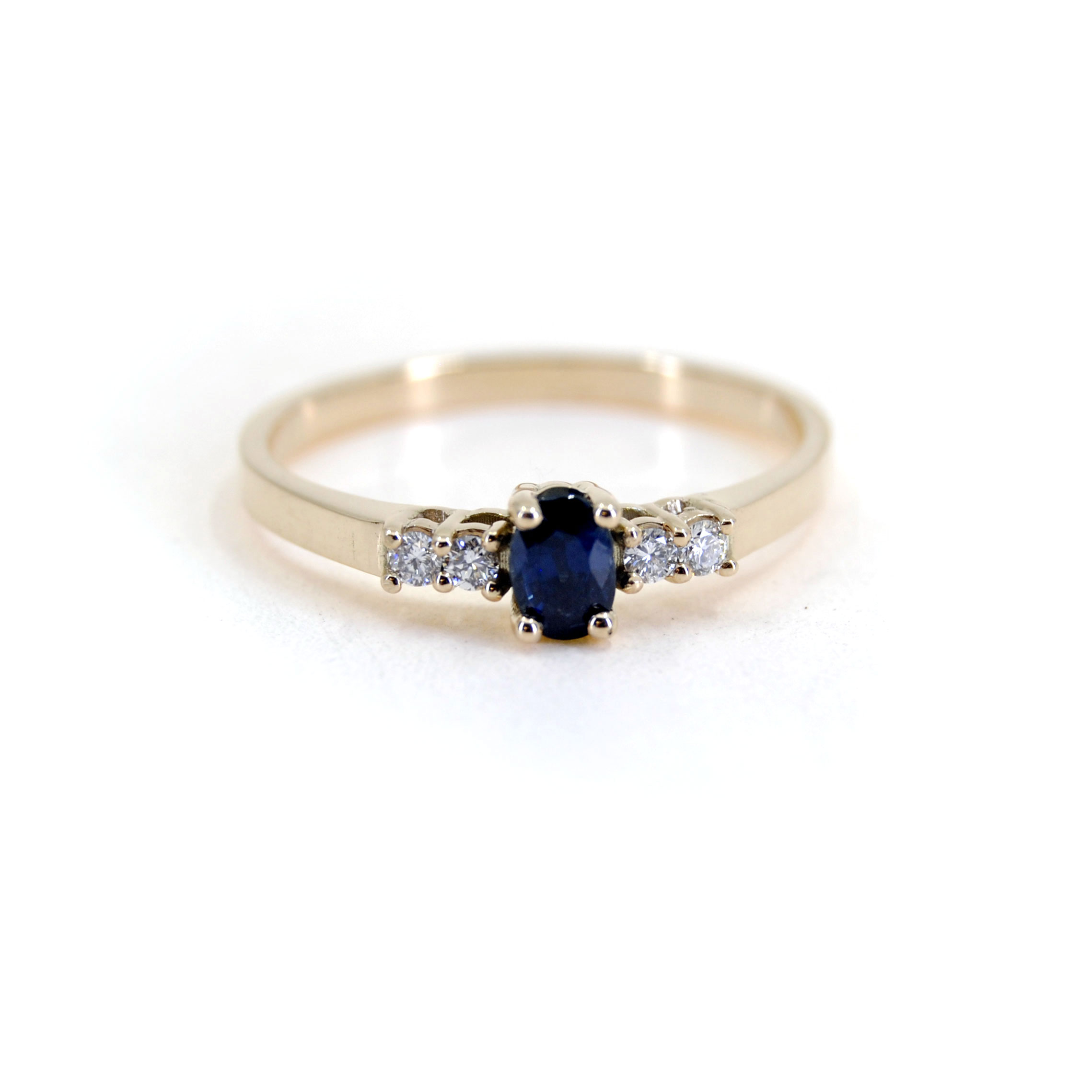 Deze verfijnde 14 karaat geelgouden ring is een perfect samenspel van klassieke elegantie en moderne luxe. In het middelpunt schittert een natuurlijke, donkerblauwe saffier van 5×3 millimeter, ovaal geslepen en gefacetteerd om het licht prachtig te vangen. De rijke, diepe kleur van de saffier wordt aan beide zijden prachtig geaccentueerd door twee briljant geslepen labgrown diamanten van elk 0,04 ct. De diamanten hebben een uitzonderlijke kwaliteit (E/VSI), wat zorgt voor een adembenemende schittering en helderheid.