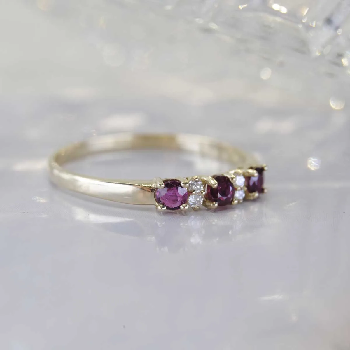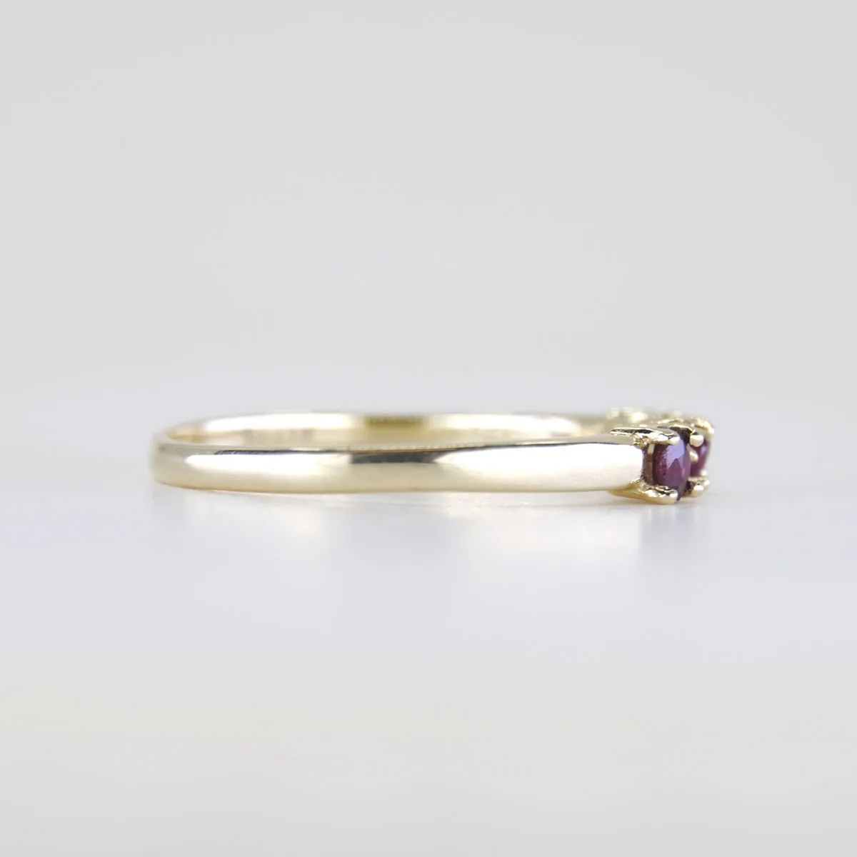 Deze prachtige 14k Geelgouden ring genaamd Toulouse is een meesterwerk dat de tijdloze allure van Robijn en Diamant combineert. Deze ring pronkt met drie sprankelende Robijn edelstenen van 2,7 mm, elk geaccentueerd door de schittering van vier briljant geslepen Diamanten.