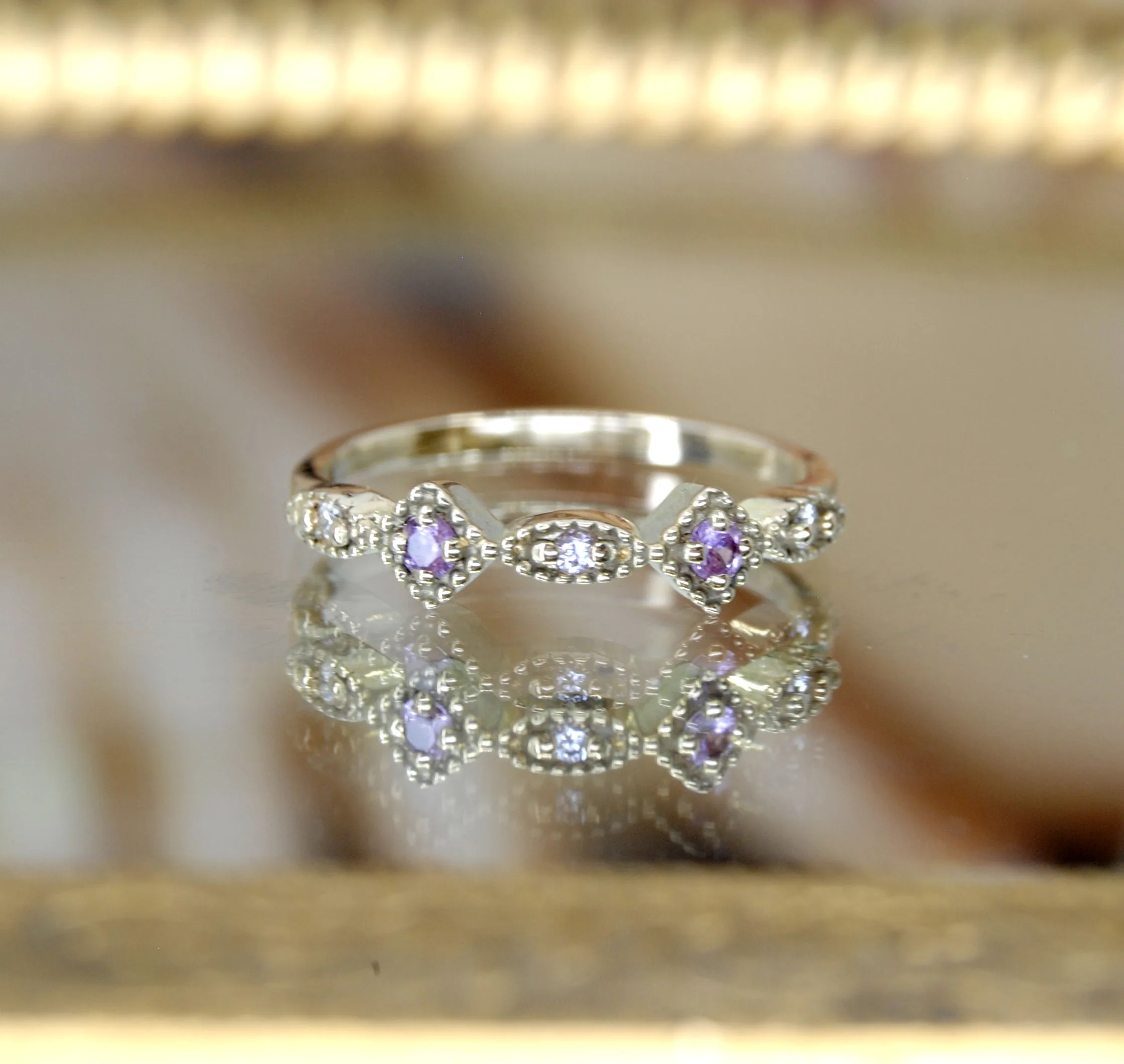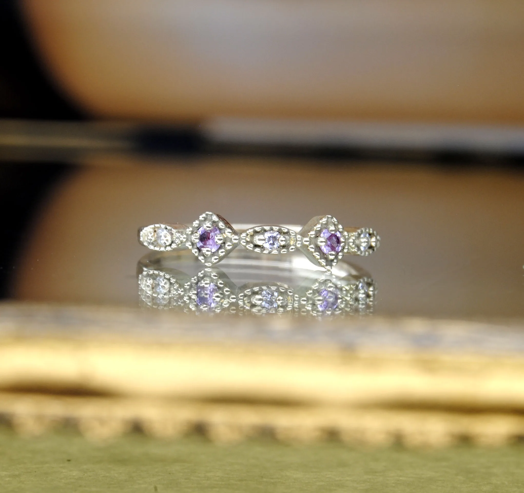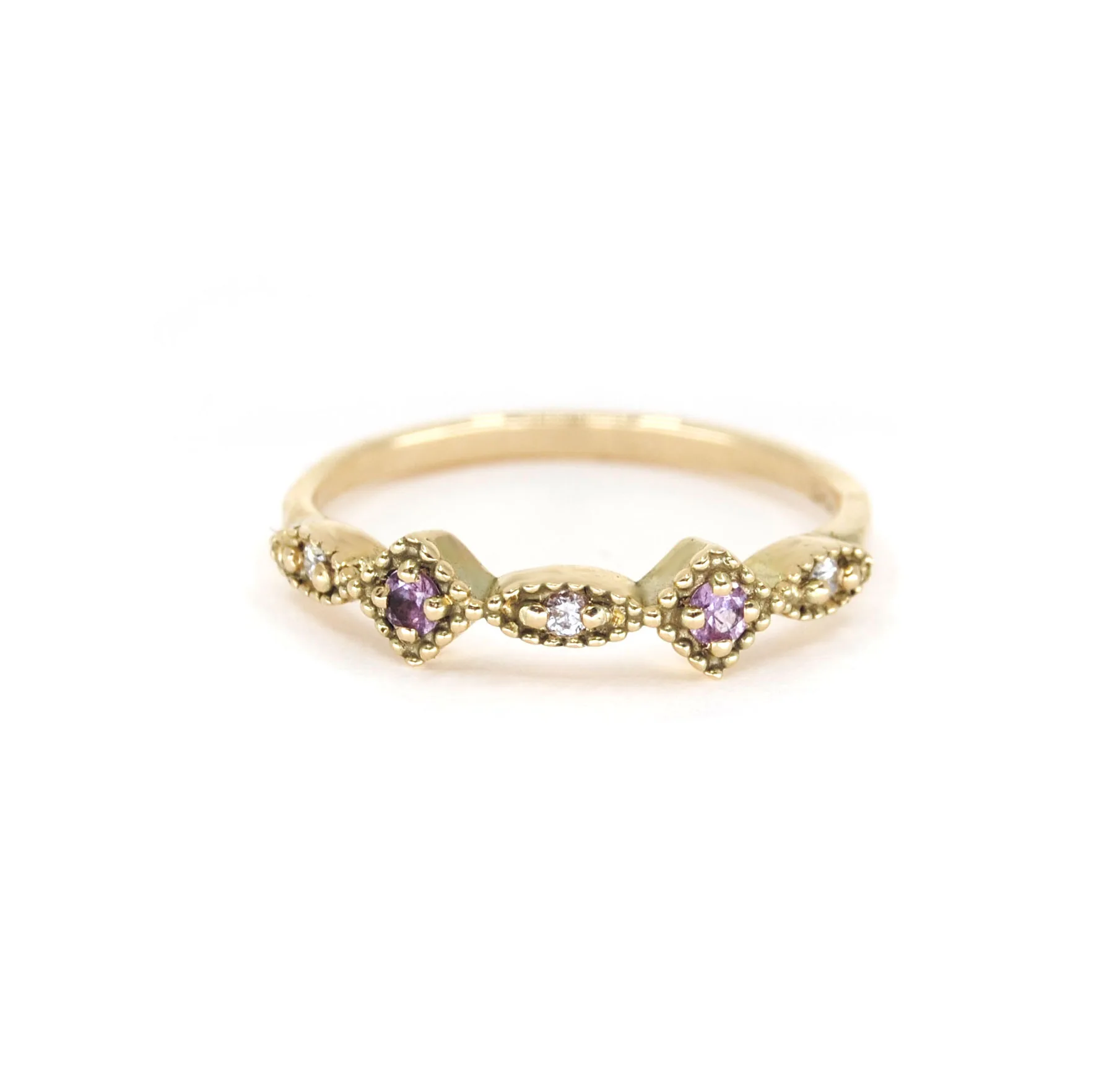 Deze schitterende moderne ring heeft een 3 prachtige geslepen Diamanten 2 lichtroze Saffieren.