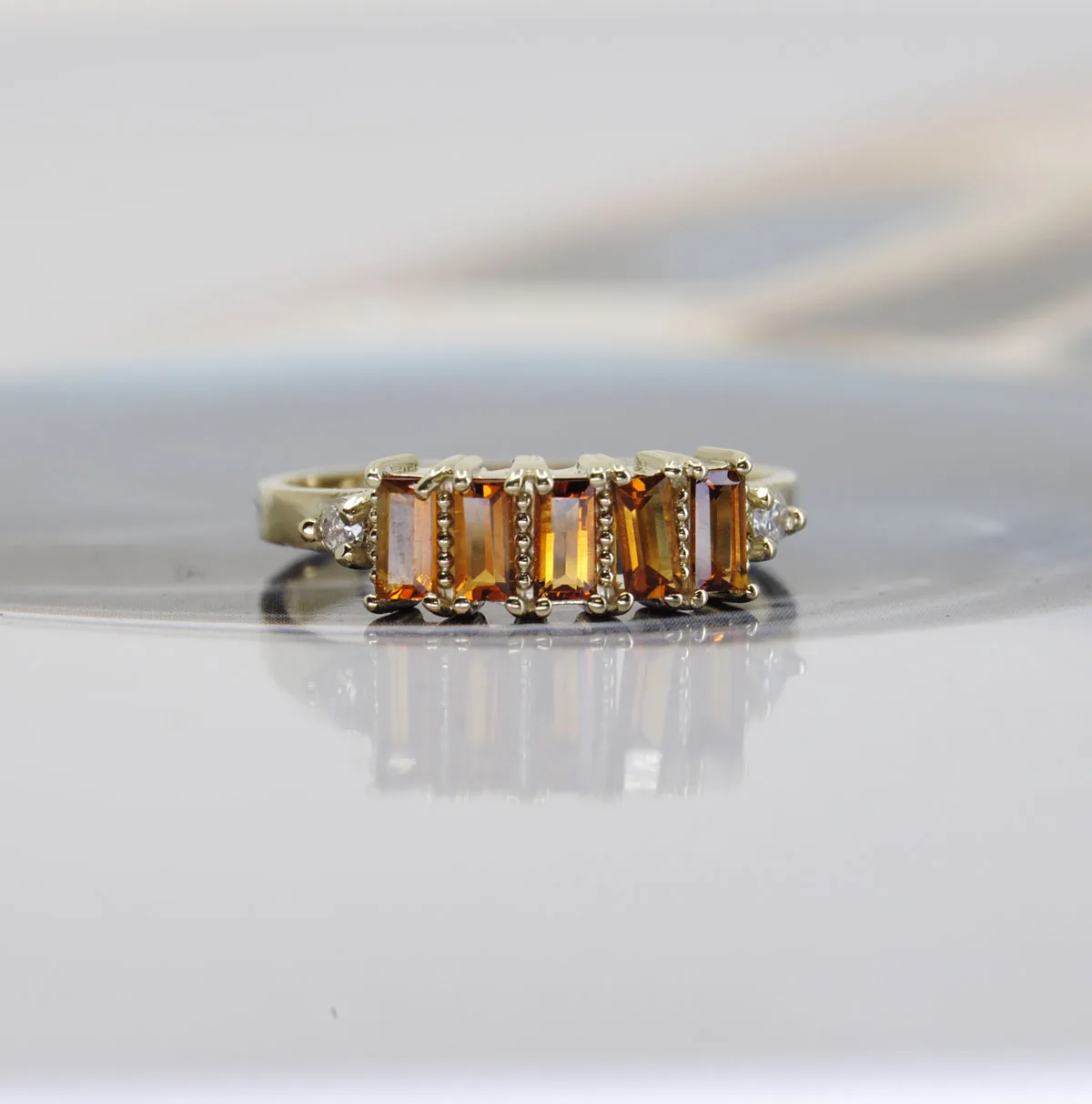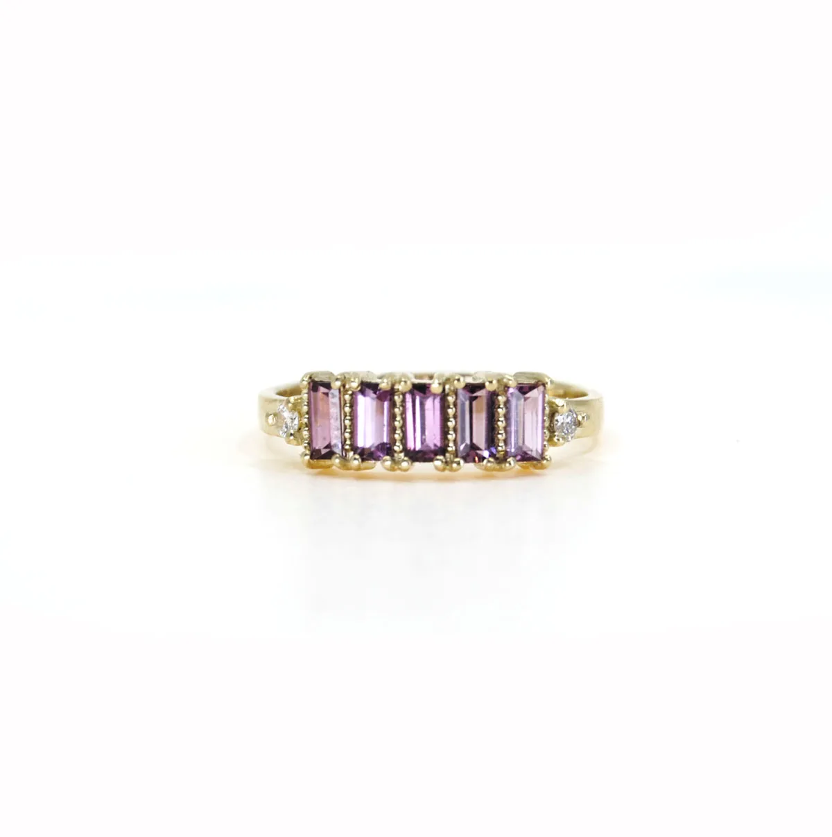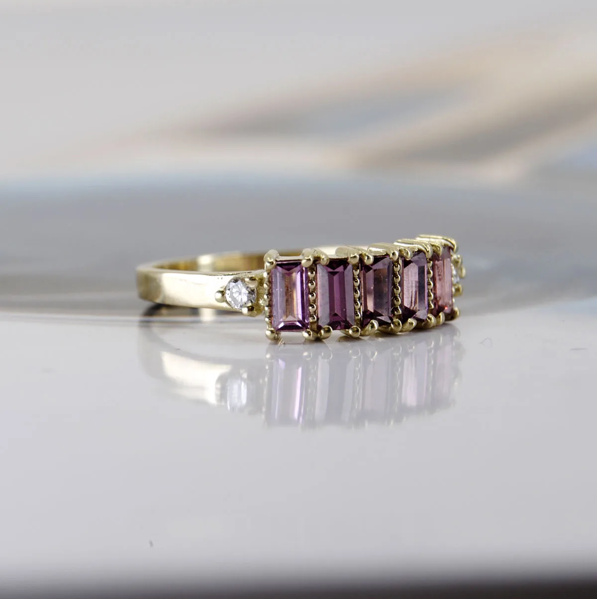 Deze schitterende ring met 5 baguette geslepen Rhodoliet en 2 Diamanten is gemaakt van 14 karaats goud. De Rhodoliet edelstenen hebben een grootte van 4 mm bij 2 mm en de diamanten hebben een grootte van 2 mm.