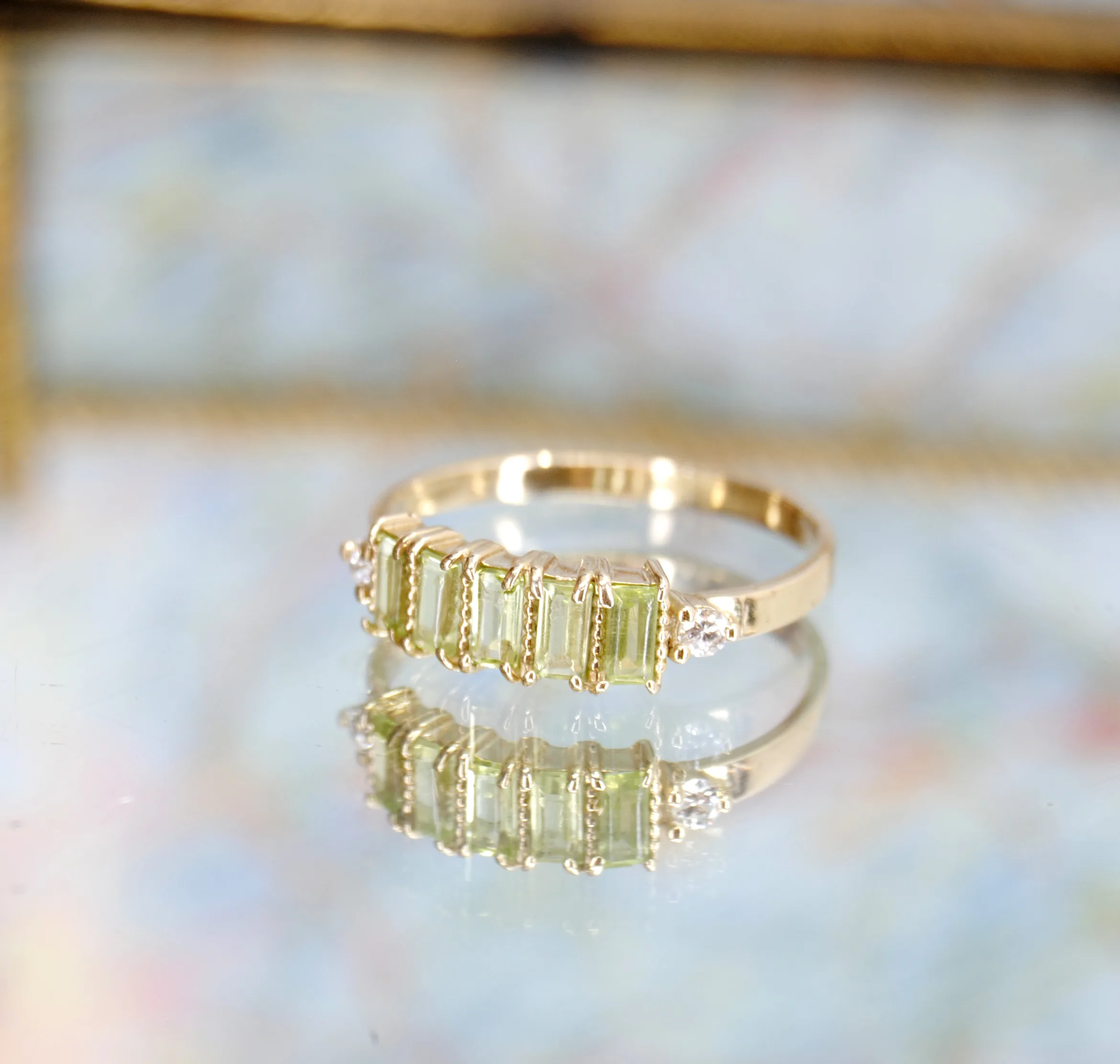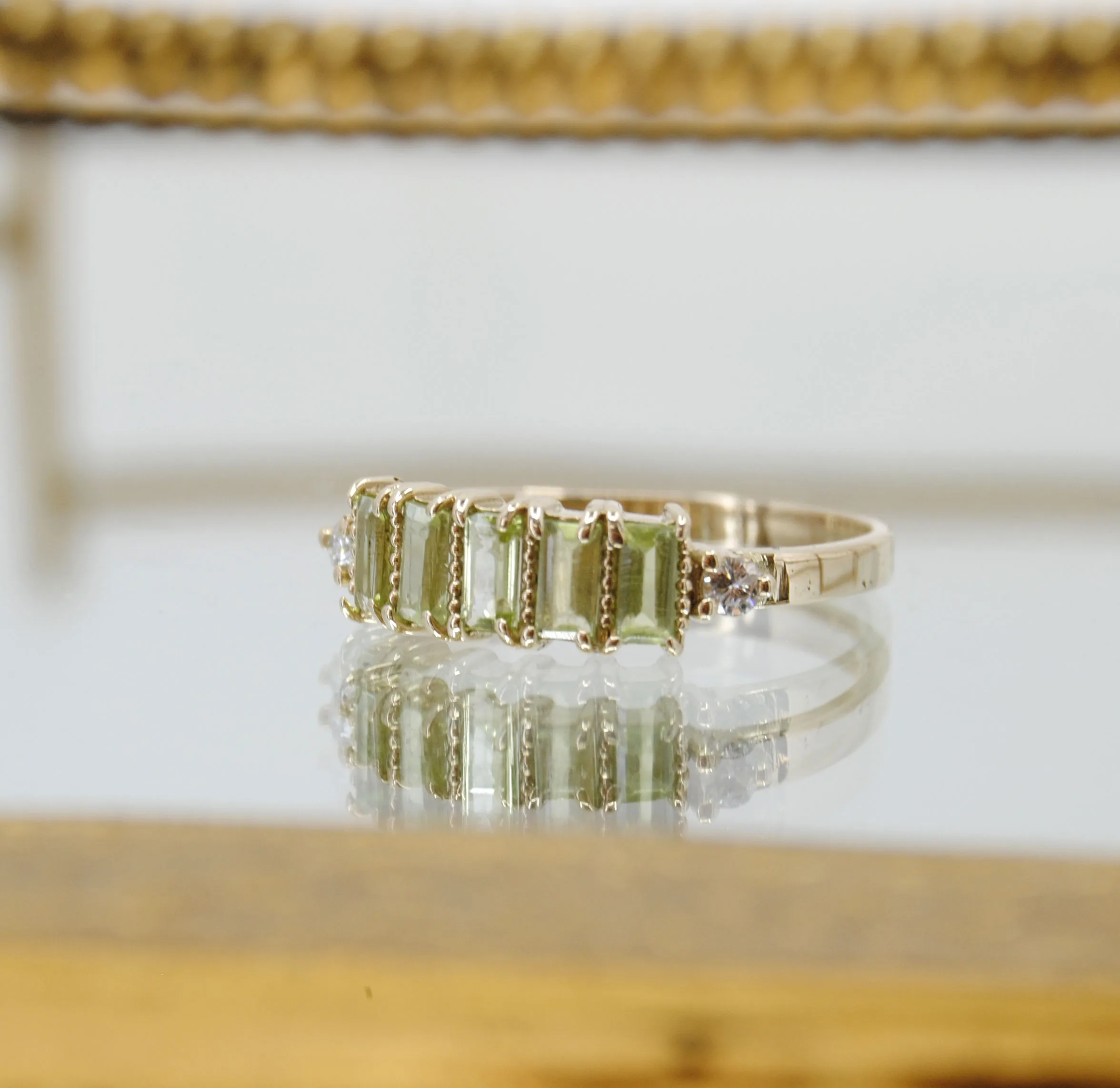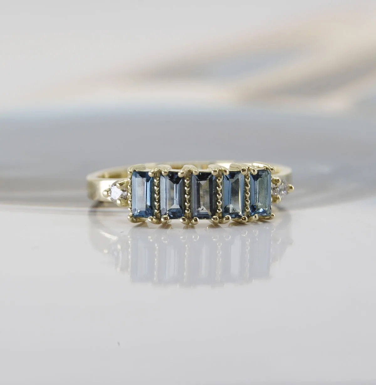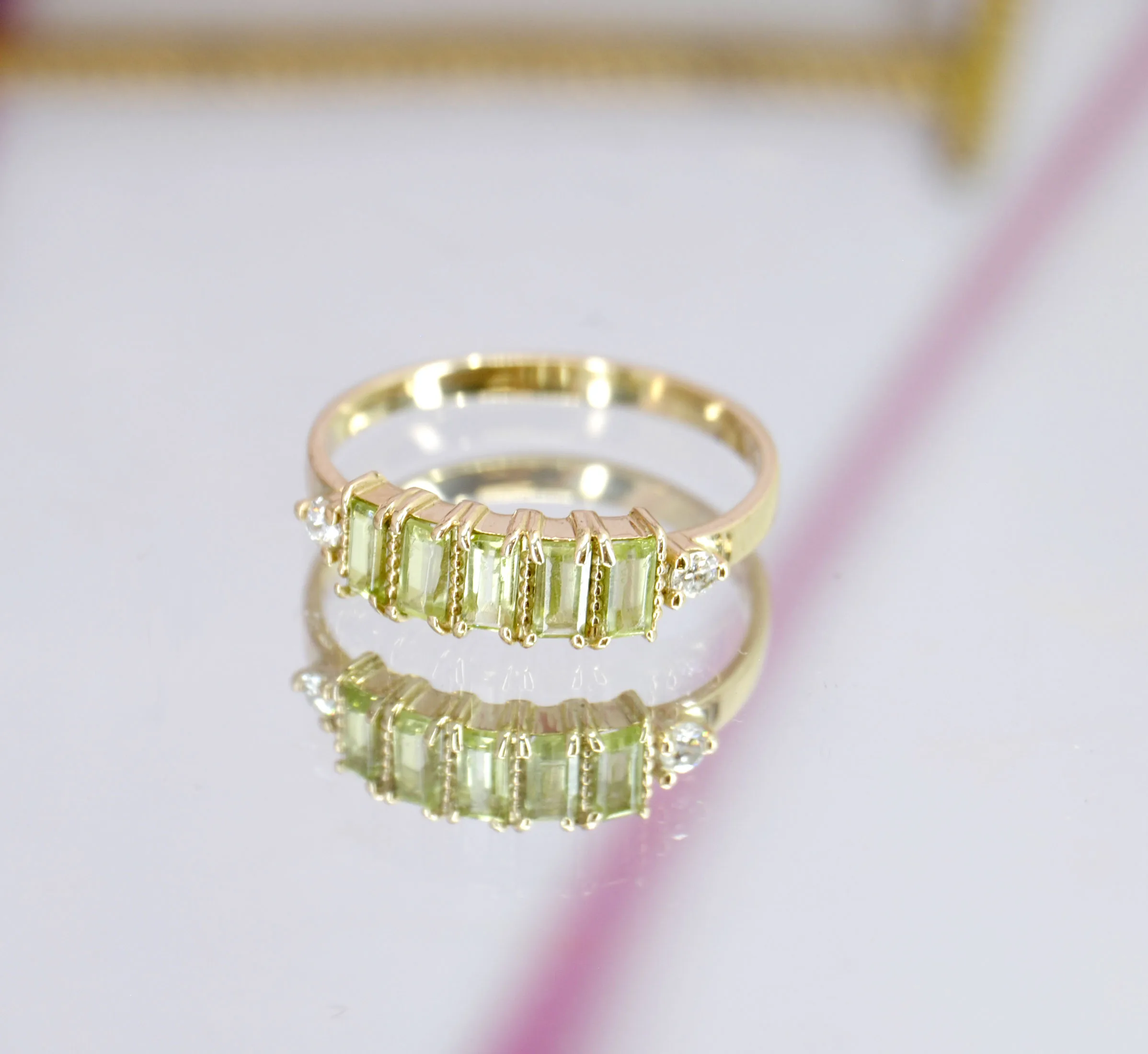 Deze schitterende ring met 5 baguette geslepen Rhodoliet en 2 Diamanten is gemaakt van 14 karaats goud. De Rhodoliet edelstenen hebben een grootte van 4 mm bij 2 mm en de diamanten hebben een grootte van 2 mm.
