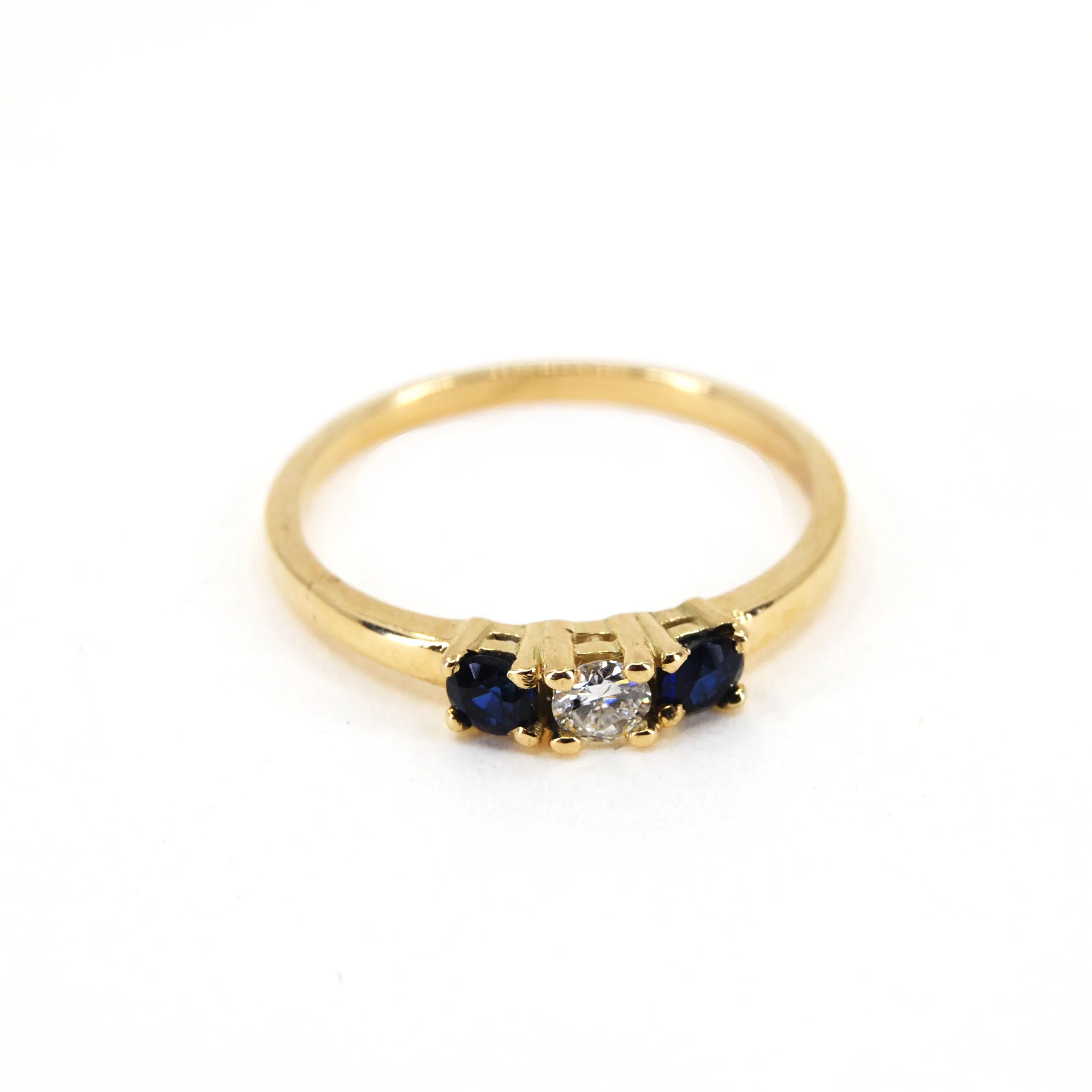 Deze prachtige geelgouden ring van 14 karaat bevat 2 saffieren van 3,0mm. en 1 Labgrown diamant van 0,10crt..