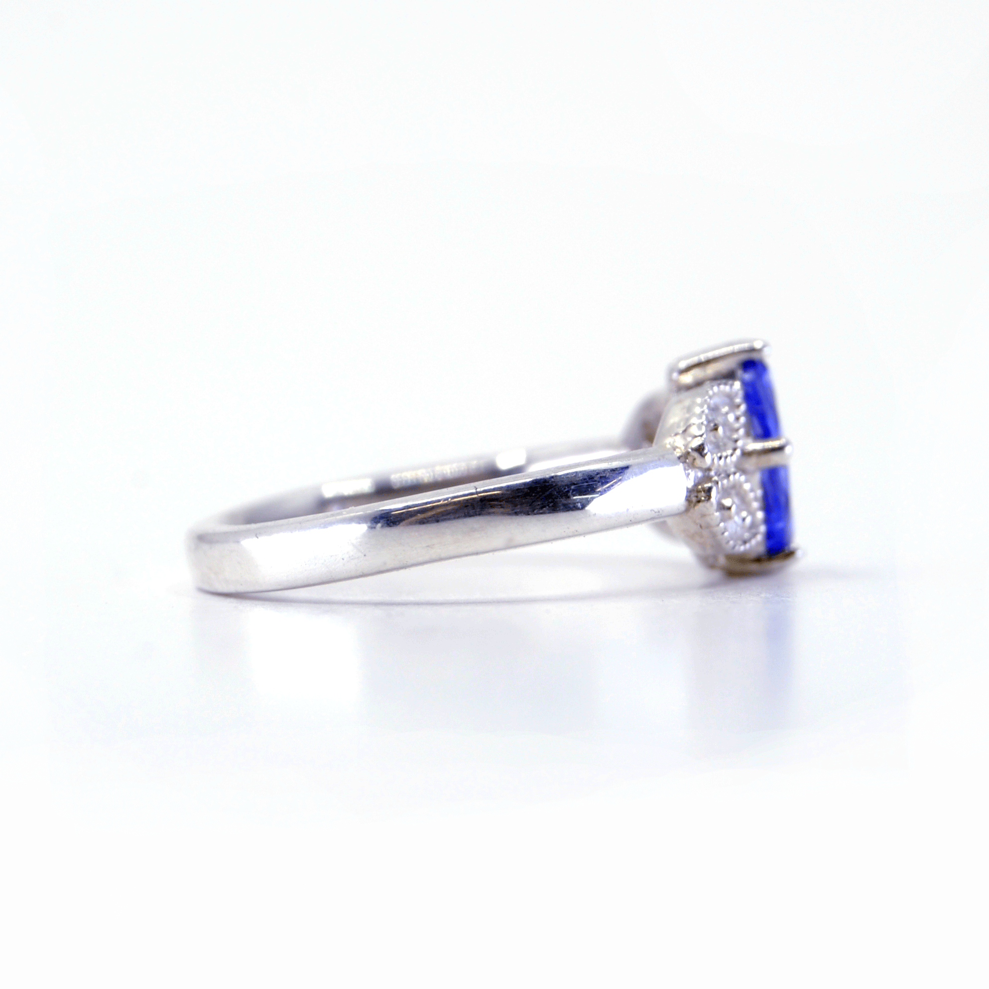 Aan weerszijden van de tanzaniet schitteren twee verfijnde diamanten van elk 1,9 mm, die subtiele glinsteringen toevoegen en het ontwerp naar een hoger niveau tillen. De diamanten versterken de tijdloze schoonheid van de centrale steen, waardoor de ring een perfecte balans biedt tussen kleur en helderheid.